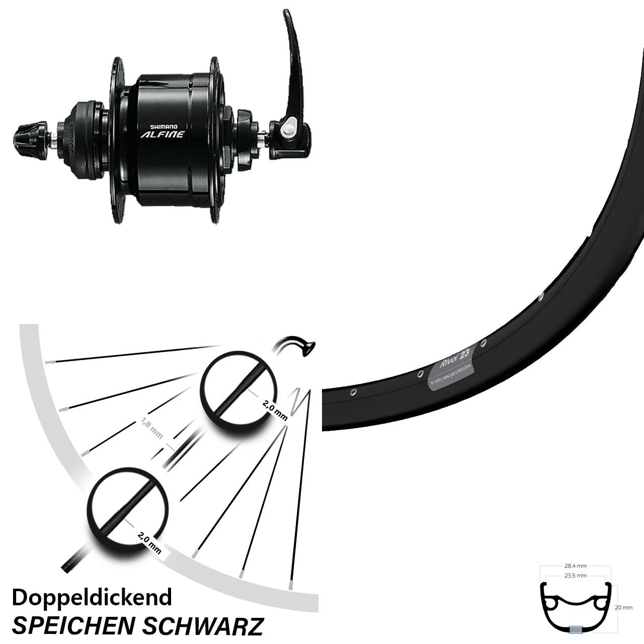 - Vorderrad 28 Zoll, 29 Zoll Ryde Rival 23 schwarz mit Nabendynamo Shimano Alfine DH-S501 schwarz