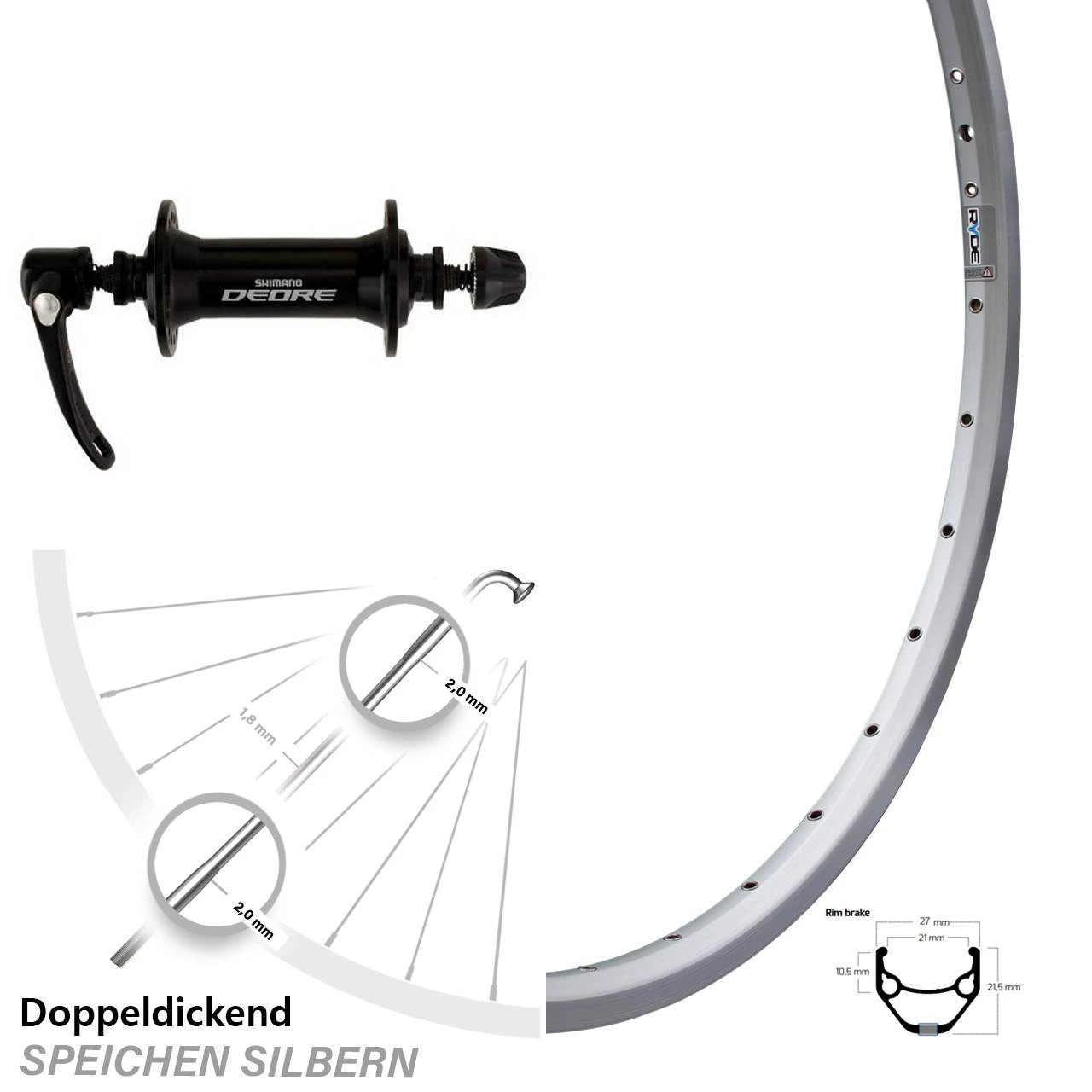 Technische Daten Vorderrad Ryde ZAC 421 Felgenbremse silbern mit Nabe Shimano HB-M590 schwarz