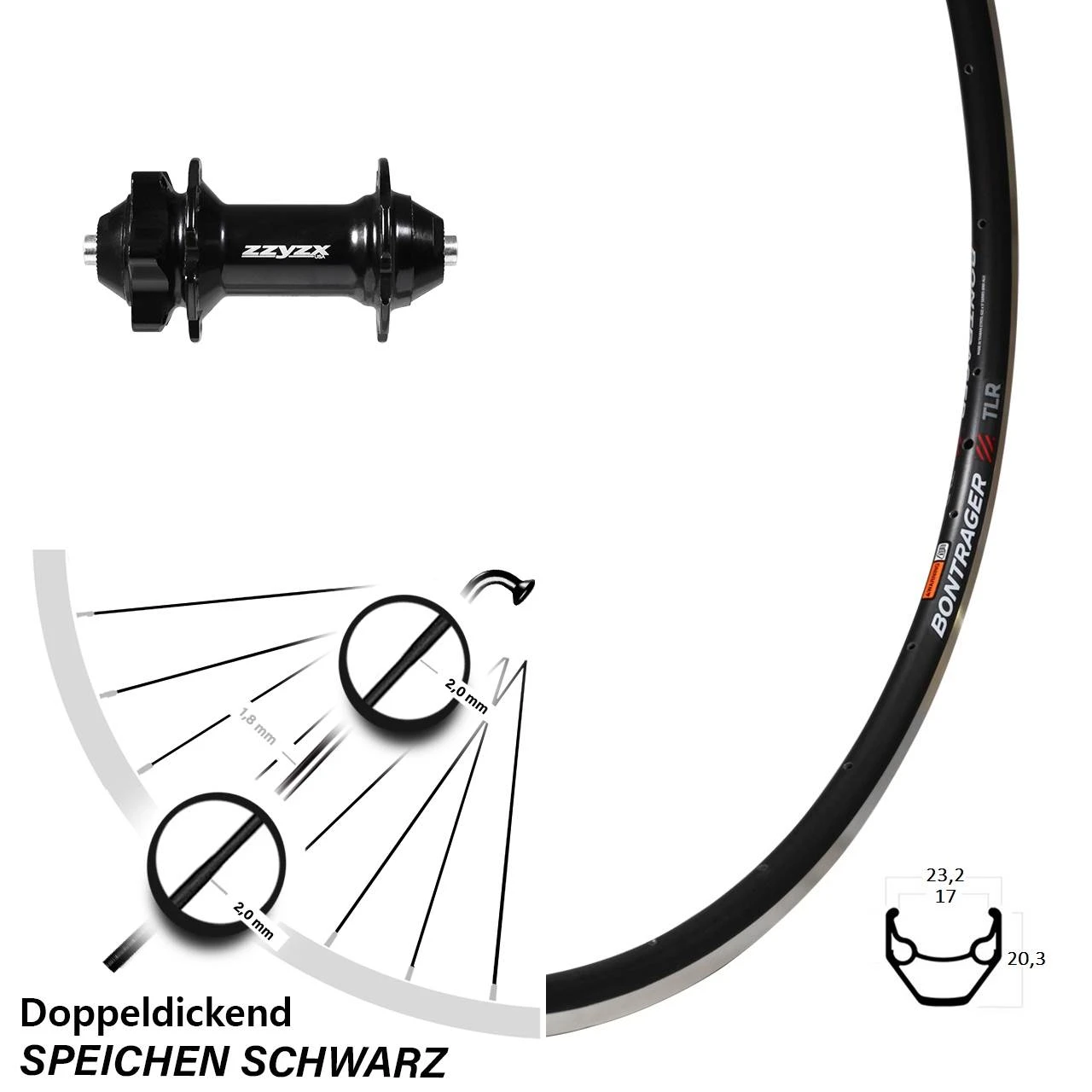 Das Vorderrad Bontrager TLR Felge & Formula ZZYZX DC-93 schwarz mit einer Größe von 28 Zoll weist eine Einbaubreite von 100 mm auf.
