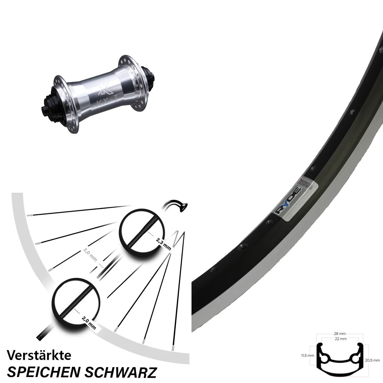 Das 28 Zoll Zoll große Vorderrad hat 100 mm Einbaubreite, eine ETRTO Größe von 22-622 mm und wird im Trekkingbike / Citybike, Bikepacking Bereich eingesetzt. Sein maximal zulässiges Systemgewicht beträgt bis zu 150 kg. Die integrierte schwarze Ryde Andra 35 Felgenbremse schwarz Felge hat eine Ventillochbohrung von 6,5 mm (darf auf 8,5 mm aufgebohrt werden). Die silberne KX-T Vorderradnabe 5/100 Felgenbremse silbern Nabe unterstützt den stabilen Ausbau des Laufrads. Somit sind Sie auf ebenen, aber auch auf unbefestigten,unasphaltierten Untergründen im Gelände bestens ausgestattet. Es ist speziell auf Bikes mit Felgenbremsen ausgerichtet und kann bei uns mit 36 schwarzen Speichen erworben werden, um Ihr Rad ideal für den Trekkingbike / Citybike, Bikepacking Bereich auszustatten!