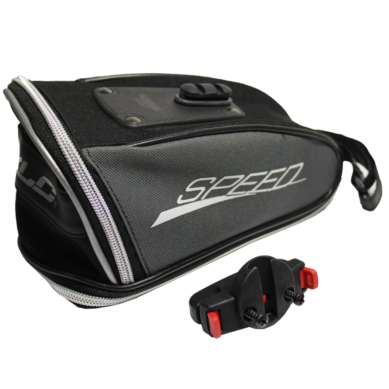 Die BA-S26 Traveller Satteltasche von XLCwird per Klickfix mit Klettband am Sattelrohr montiert. Das Volumen von 1,2 l kann durch Öffnungen an den Seiten auf 2,4 l erweitert werden. Die Tasche verfügt über Reflexstreifen und ist an ungefederten Sätteln verwendbar.